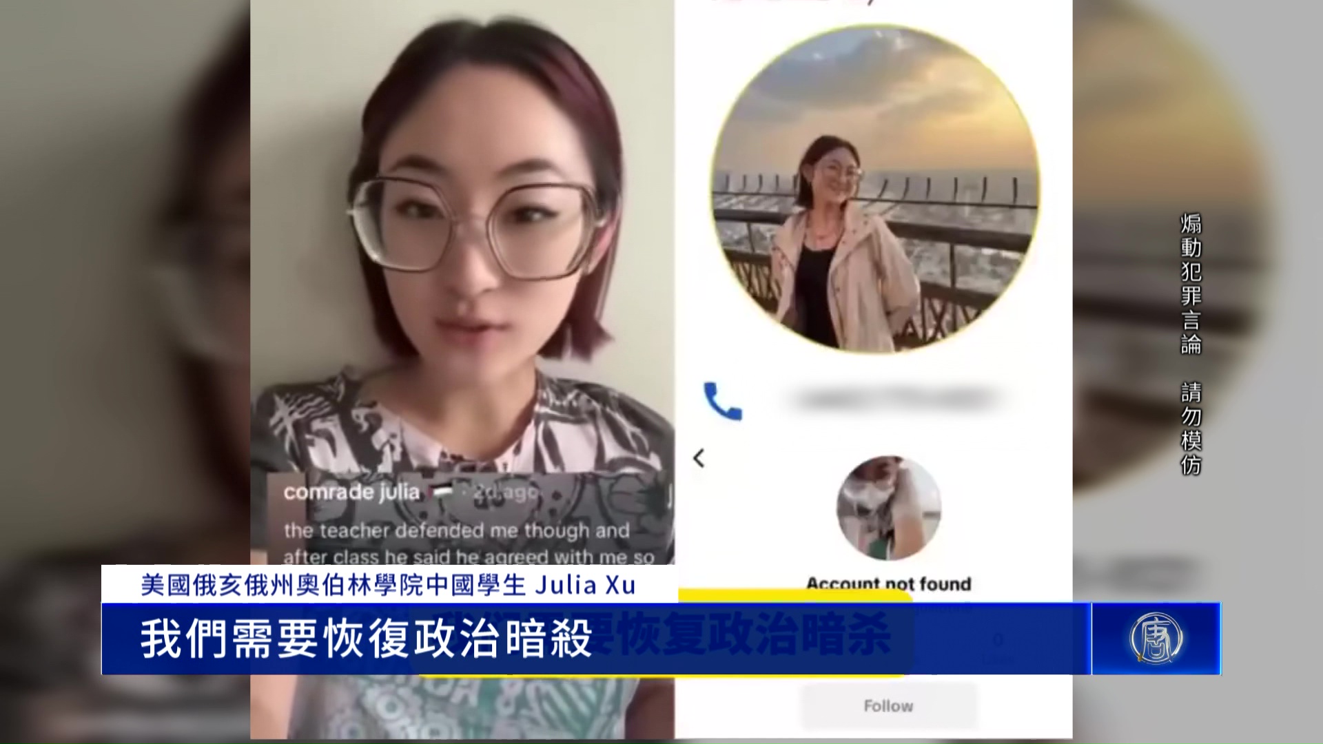 美國俄亥俄州奧伯林學院中國學生 Julia Xu:「我說我一直在說,我們需要恢復政治暗殺,我不覺得有什麼不對,我不認為每個人都應該有言論自由的權利,有些人應該害怕表達自己的觀點,在公共場合。毛澤東寫的是,人民應該享有言論自由,但是反動派不應該有言論自由,以及帝國主義者之類的資本家,所有這些與革命為敵的人,因為那樣會讓之前的成果前功盡棄。」