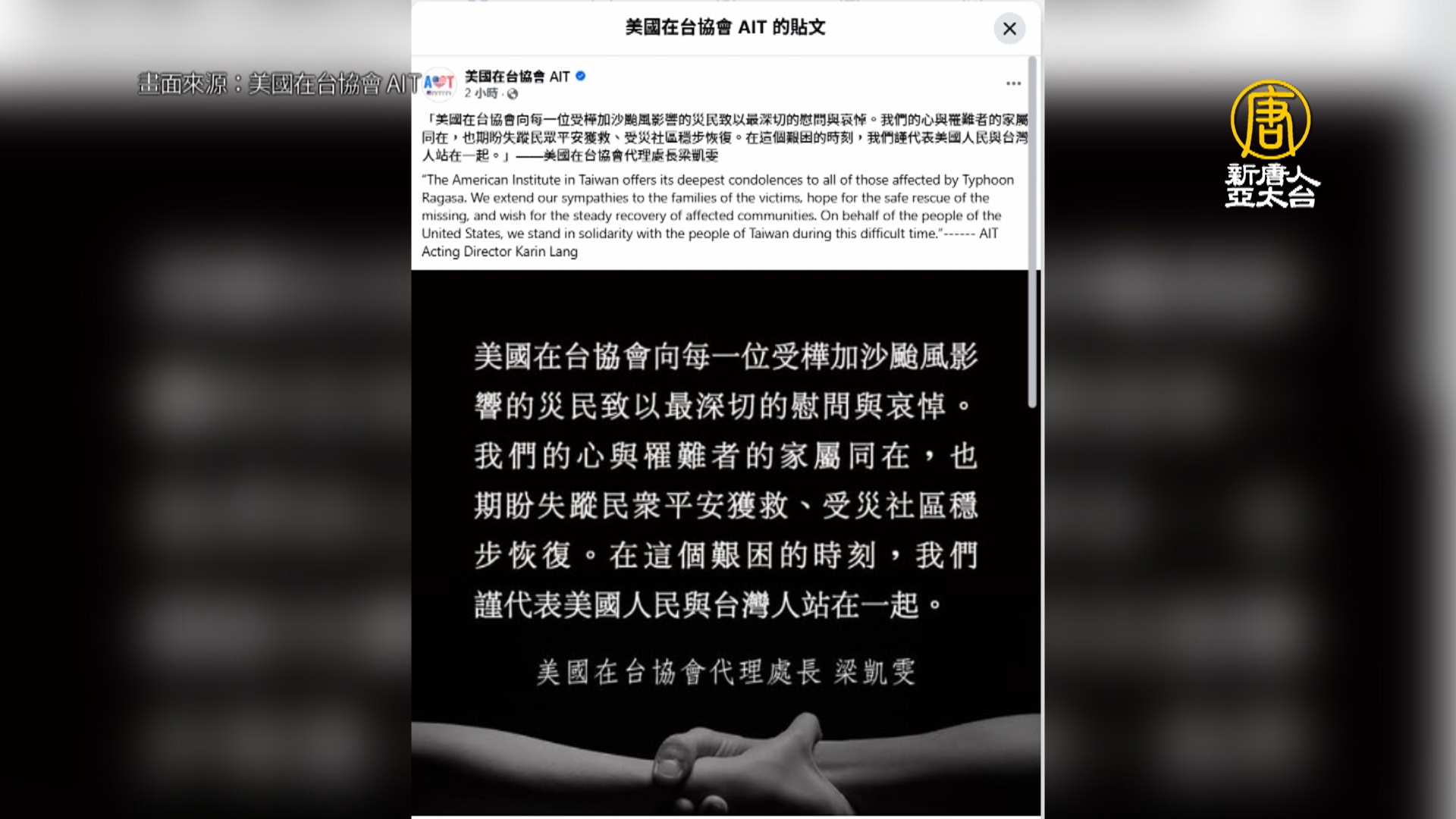 【新唐人亞太台 2025 年 09 月 25 日訊】台灣花蓮縣的馬太鞍堰塞湖,發生溢流,已知14人死亡,災民急需食物跟飲水,各界捐款及資源紛紛湧入,而美國、日本和以色列等駐台機構紛紛透過社群平台發文慰問災民。