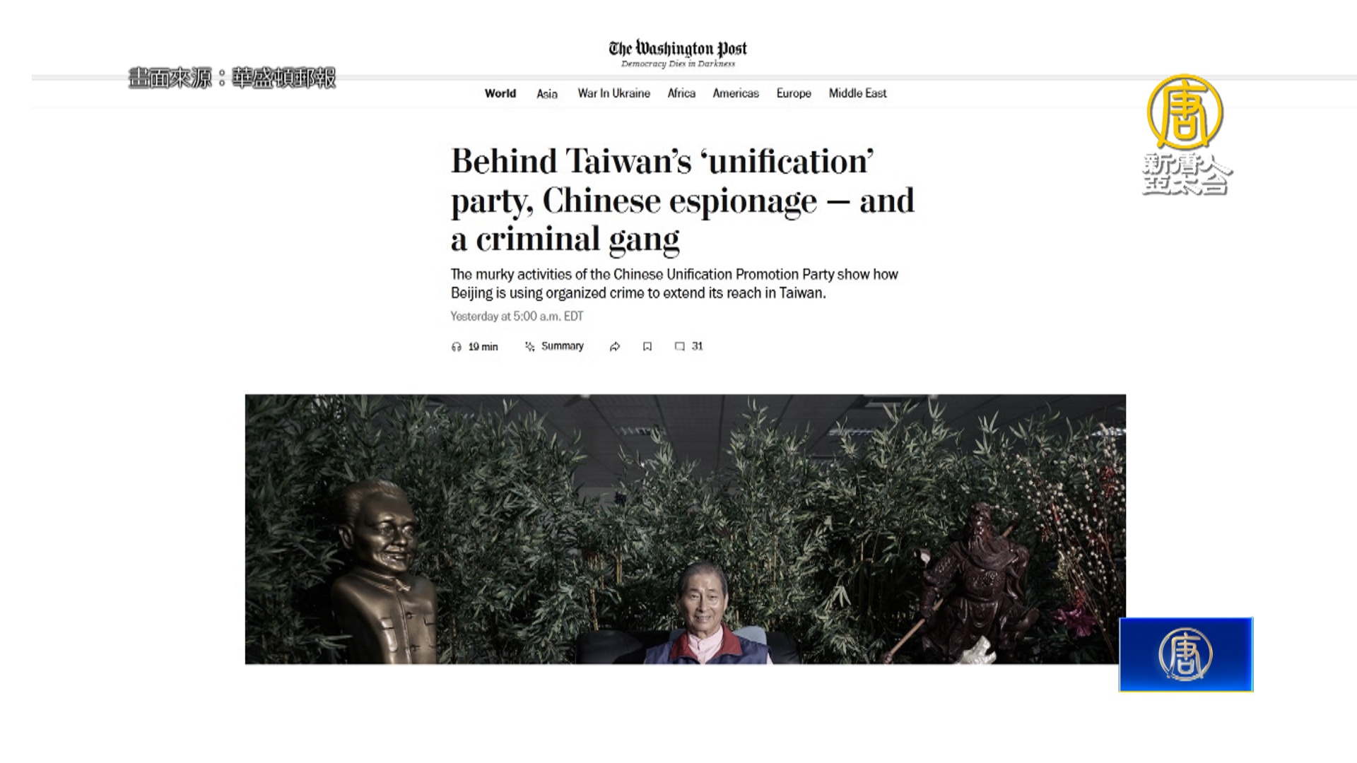【新唐人亞太台 2025 年 09 月 30 日訊】再來看到,中共對台灣滲透引起外國關注,美國華盛頓郵報刊文,標題是:台灣的「統一促進黨」背後有中共間諜活動和犯罪集團,這篇長文提到,統促黨總裁張安樂曾在中國經商20年,統促黨成員經常利用在黑道與政治交集的特殊位置,推動中共在台灣的利益,包括威脅反對中共的人士、宣傳中共政治主張,甚至試圖替中共招募間諜。報導說,中共對台灣幫派的容忍度,大過於對中國幫派。報導提到,台灣內政部已啟動解散統促黨的程序,台灣政府已對至少134名統促黨成員展開刑事調查。台灣政府擔心,一旦中共入侵台灣,統促黨可能會被中共作為武器。