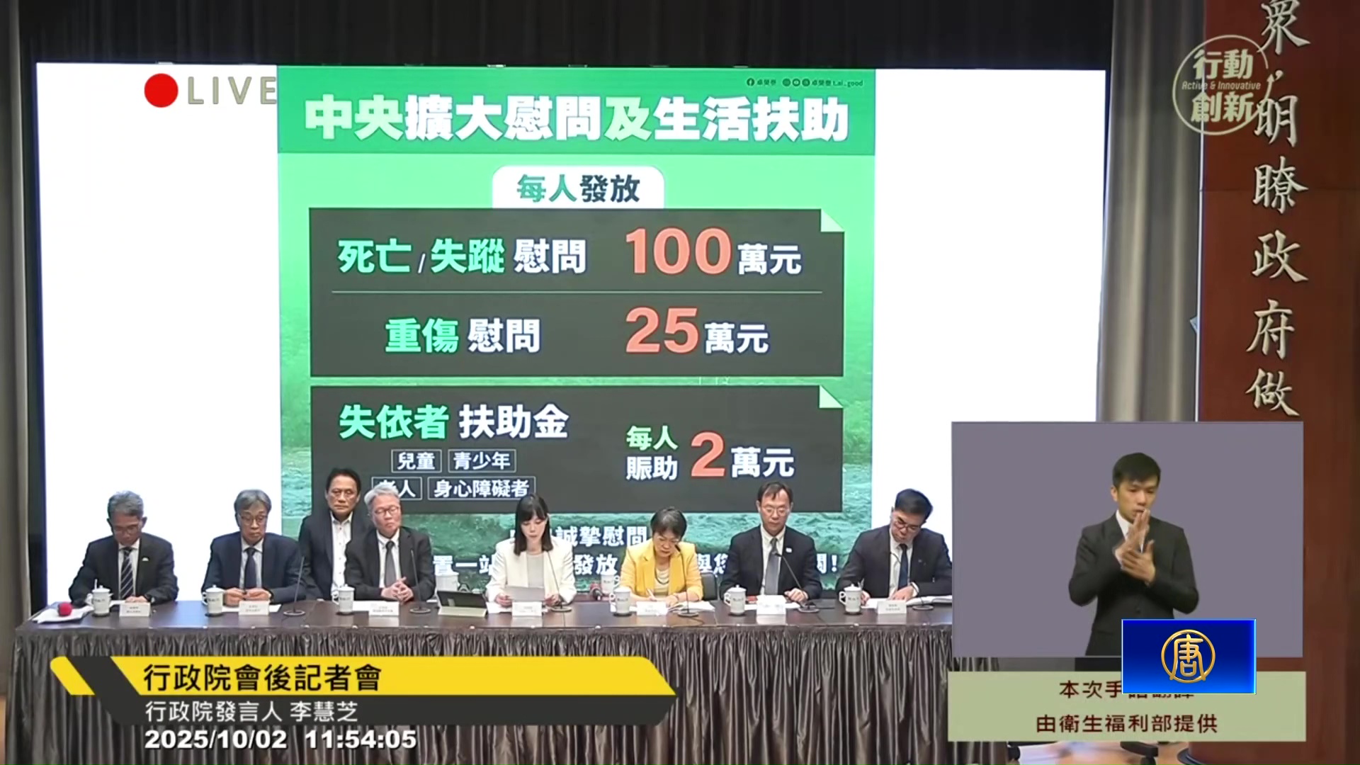 中華民國行政院發言人 李慧芝:「200億元為基礎,提出丹娜絲颱風及728豪雨,災後復原重建特別條例的修正。死亡罹難者予以100萬元慰問金,重傷者予以25萬元慰問金,失蹤者還要全力的搜尋。」