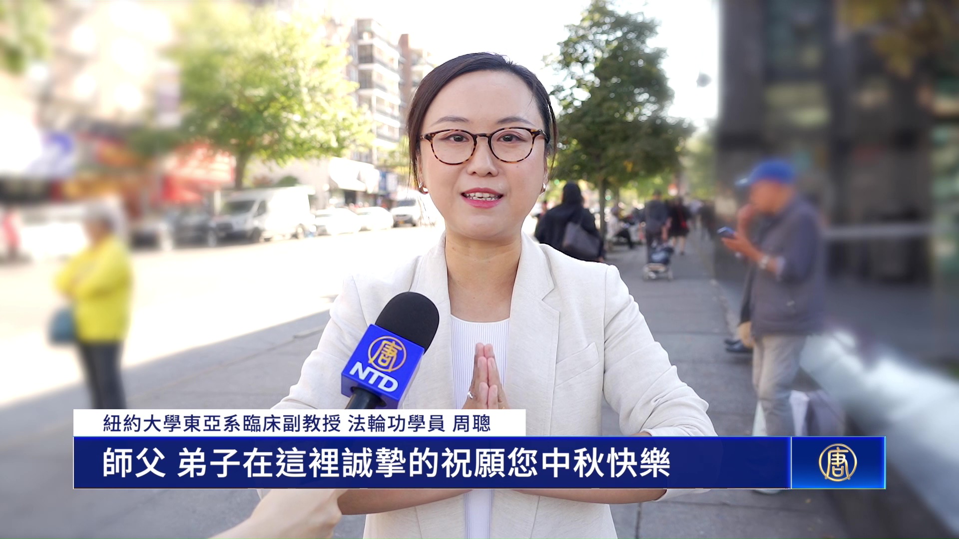紐約大學東亞系臨床副教授、法輪功學員 周聰:「修煉讓我能夠不斷地提升我的道德水平。所以其實對於很多在世俗意義上的成功,在世俗意義上的這種對社會的貢獻,也讓我有了一種不一樣的體會。師父,弟子在這裡誠摯的祝願您中秋快樂,感謝師父,感恩。」