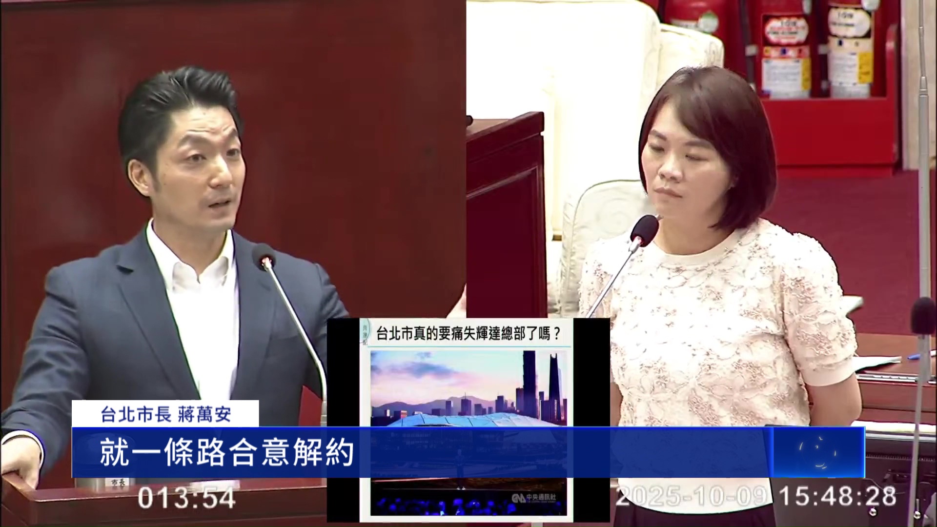 【新唐人亞太台 2025 年 10 月 09 日訊】台灣經濟部證實,輝達委託盤點,多個總部備選土地,24日前就要回覆輝達。是否輝達進駐北士科,出現變數?台北市長蔣萬安,今天接受質詢,表示與新光人壽合意解約,是唯一的一條路。市議員更表示,新新併後,新光人壽就已消滅,敦促北市府拿出魄力,發文宣告新光人壽違約。