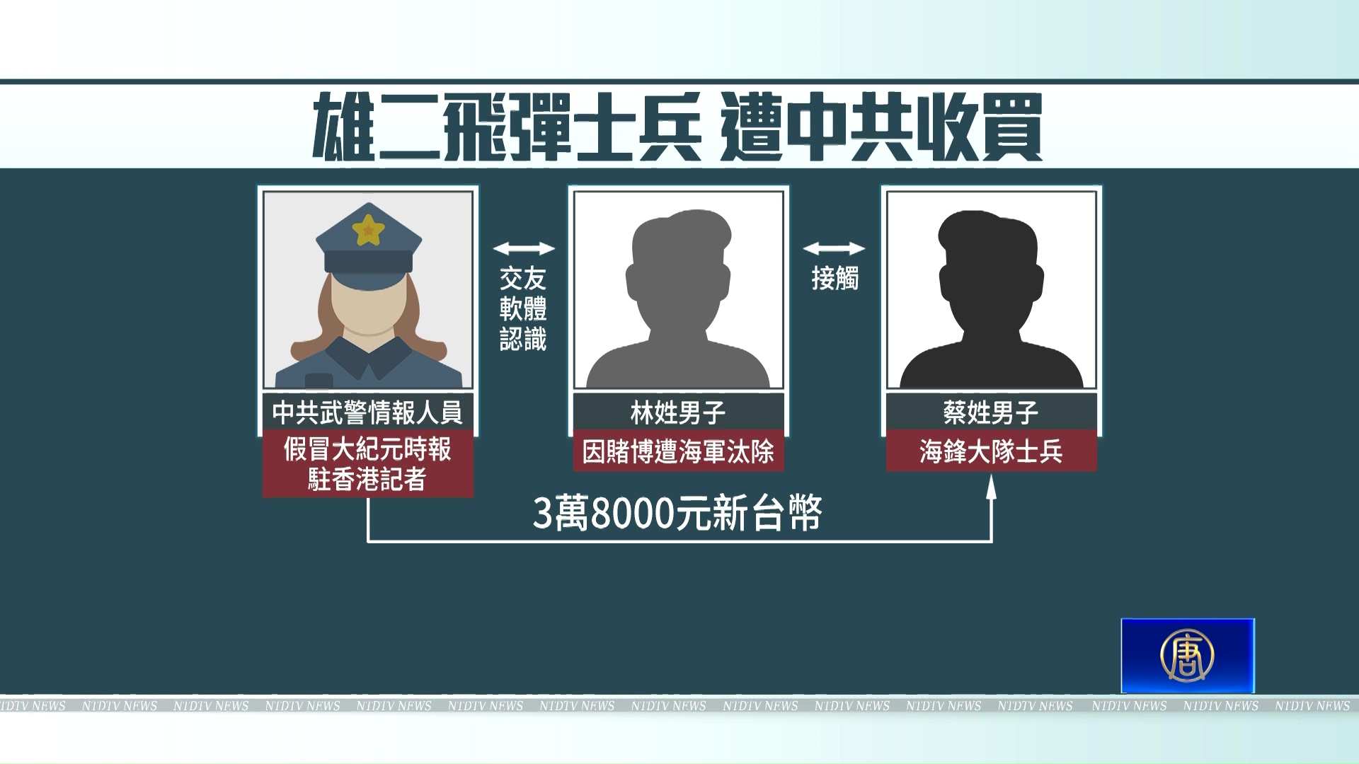 根據台中地檢署起訴書,中共武警部隊山西省總隊通信站情報人員化名「楚亭」、「緹縈」,自稱《大紀元》駐香港記者。2023年透過交友軟體吸收遭台灣海軍汰除的林姓男子,並透過林男接觸到正在服役的海軍海鋒大隊蔡姓士兵。蔡男翻拍雄風二型飛彈發射車上的放列陣地操演教範全冊、飛彈車操作手冊等資料,洩漏給「楚亭」。林男、蔡男均被起訴。