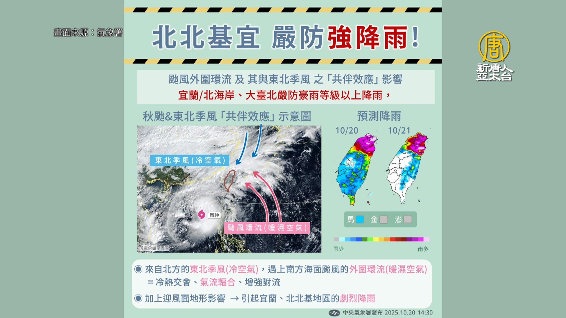 【新唐人亞太台 2025 年 10 月 21 日訊】歡迎您收看10月21日的早安新唐人,我是唐潔安,先來帶您關心天氣。受「風神颱風」外圍環流及東北季風共伴影響,宜蘭縣政府宣布今天(21日)全縣各機關學校停止上班、停止上課。北部其他縣市正常上班上課,不過,根據中央氣象署今天清晨4點「最新雨量預測」,共有4縣市雨量達停班課標準,包括台北市、桃園市、新竹縣、宜蘭縣。