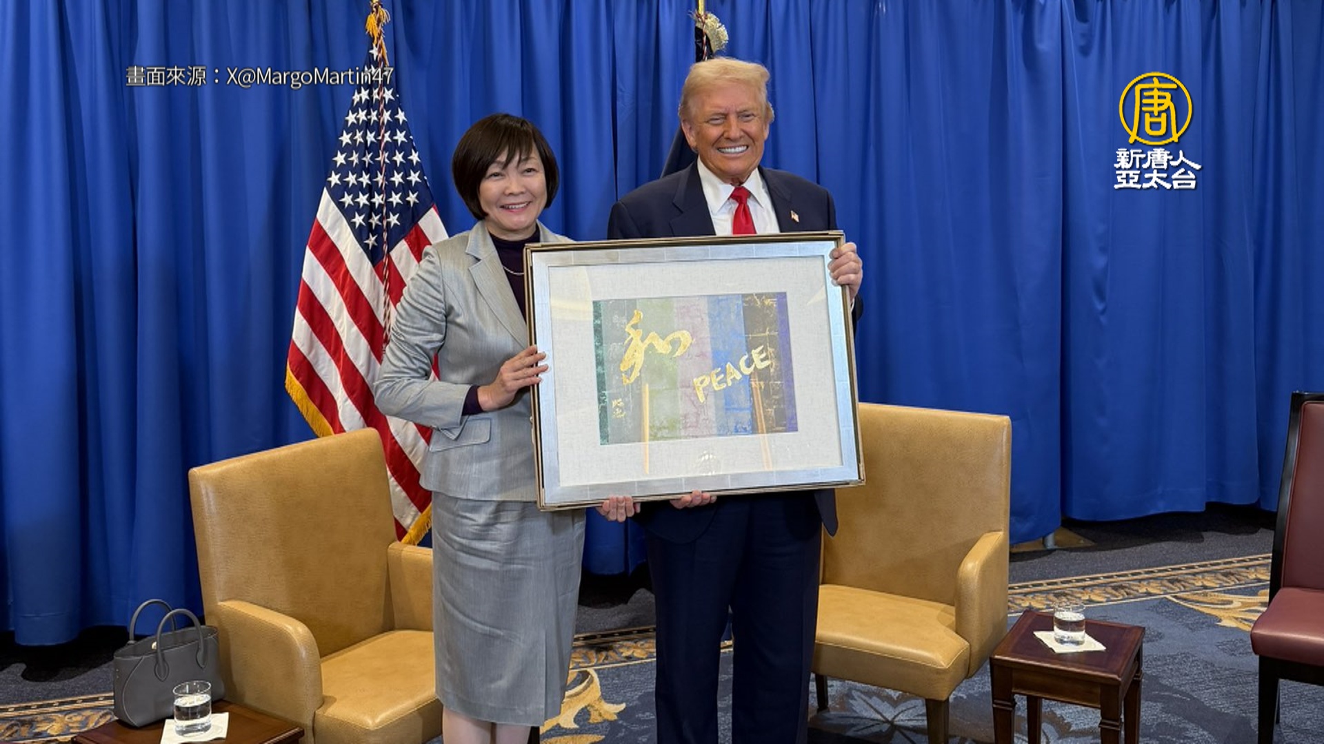 【新唐人亞太台 2025 年 10 月 29 日訊】美國總統川普昨天在日本會見日本前首相安倍晉三的遺孀安倍昭惠,並獲安倍夫人贈送一幅她創作的畫,以綠、紅、藍、黑等顏色組成,且以金色寫上「和平」字樣。