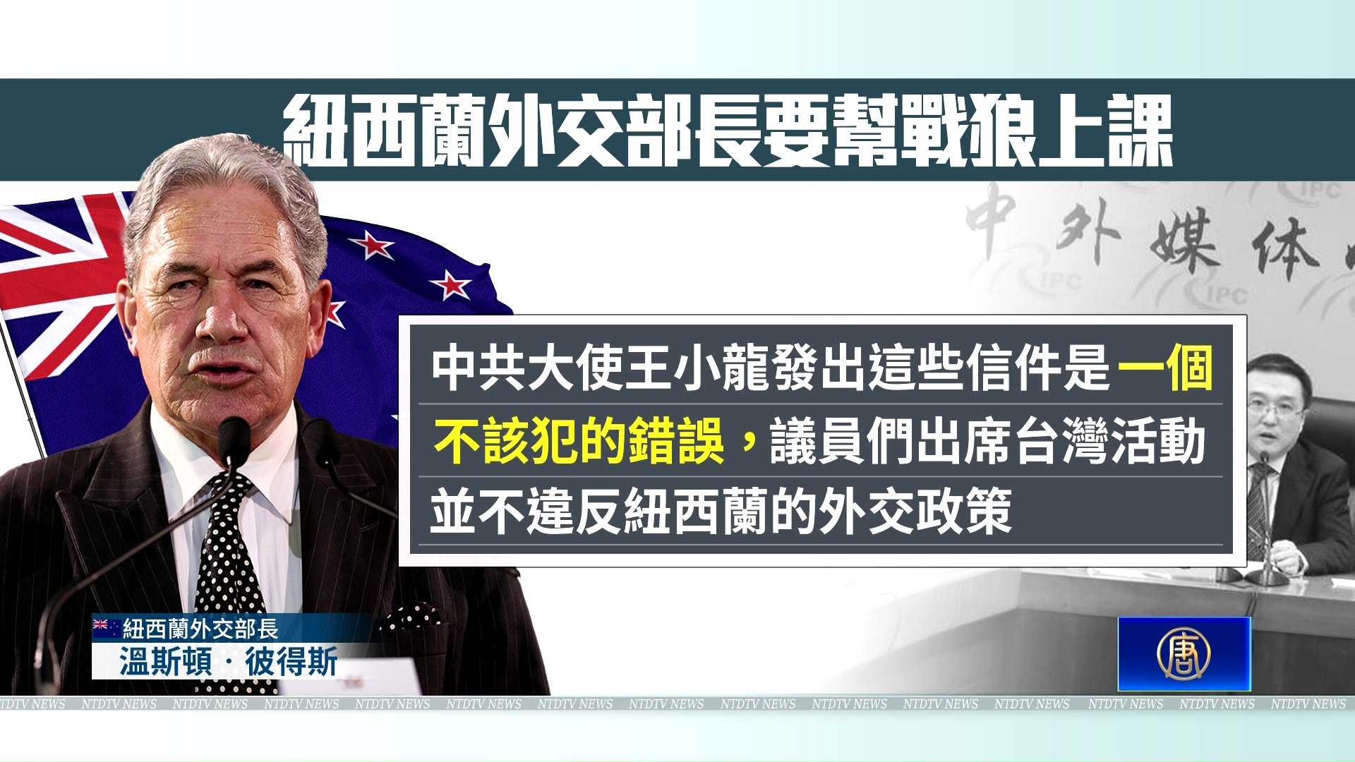 據紐西蘭《郵報》(The Post)4日報導,紐西蘭外交部長溫斯頓•彼得斯(Winston Peters)回應表示,中共大使王小龍發出這些信件是「一個不該犯的錯誤」,議員們出席台灣活動並不違反紐西蘭的外交政策,它是民主的本質,議員們的責任在於他們的選區。他願意給王小龍講一講什麼是「民主」。