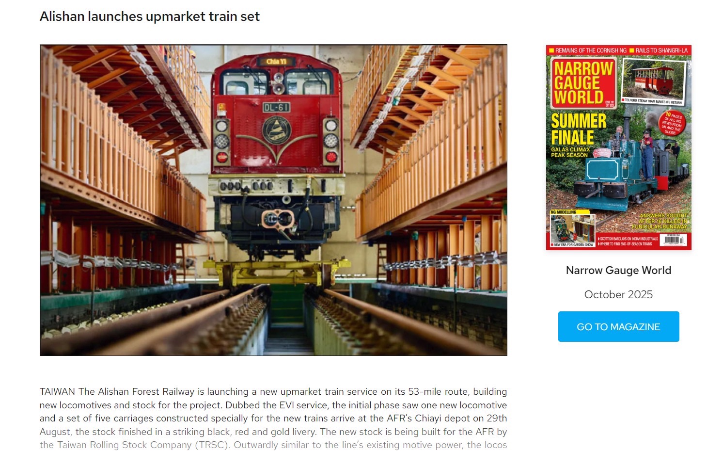 英國鐵道專刊《Narrow Gauge World》專文報導「森里號」,百年林鐵展現新風貌。(林鐵及文資處吳明翰攝)