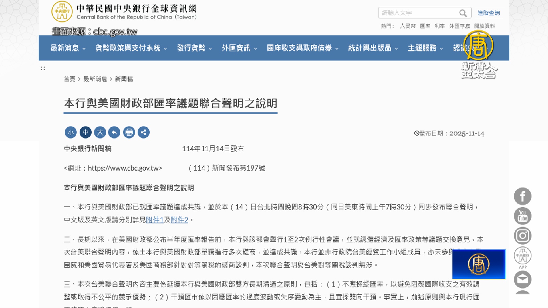 【新唐人亞太台 2025 年 11 月 17 日訊】再來看到,台灣央行跟美國財政部上週五共同發布匯率政策與外匯資訊揭露的聯合聲明。聲明指出,作為可信賴的夥伴,雙方決定持續針對外匯事務等議題密切磋商;確認將避免操縱匯率,平面媒體引述官員說法指出,這顯示台美關稅的整體協議已近尾聲,有機會在近日公布。另外,與南韓、瑞士等國不同,台灣並未被要求揭露外匯存底的幣別比重,官員解讀,這形同美方給予台灣匯率政策上的「一票信任票」。
