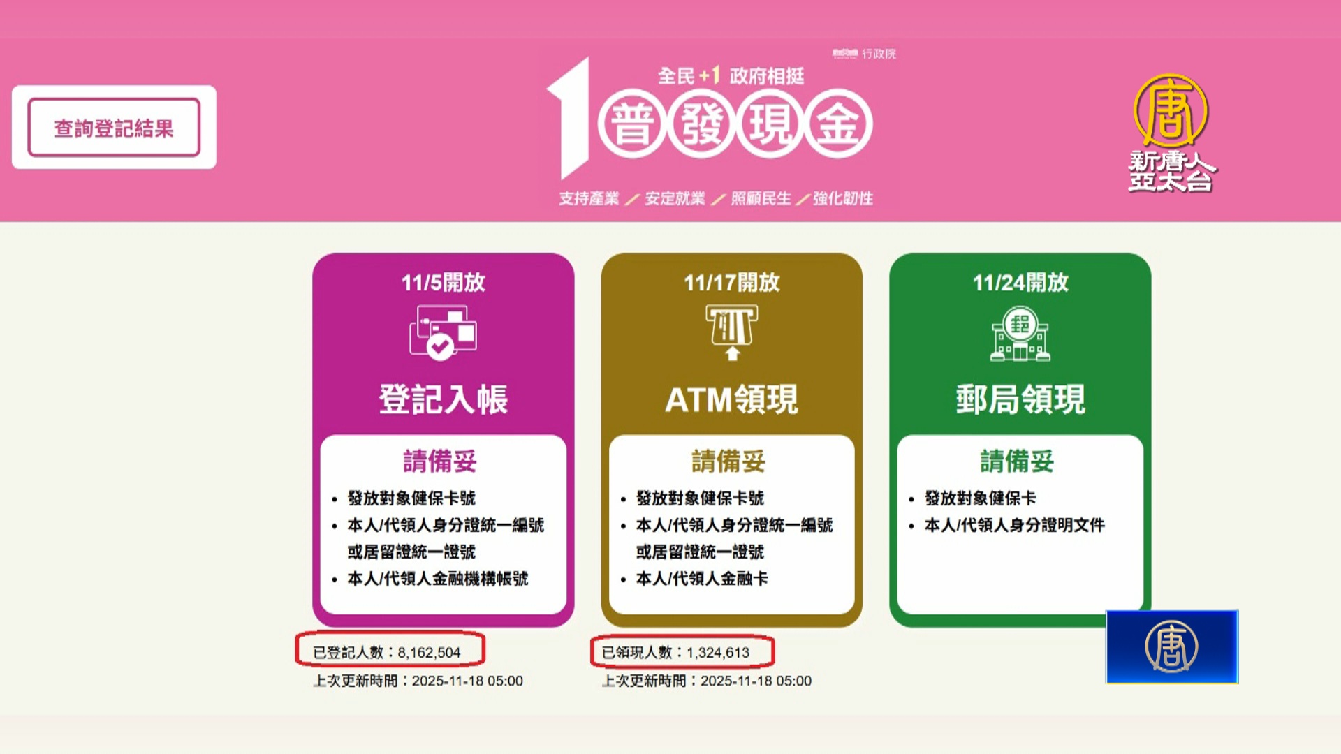 【新唐人亞太台 2025 年 11 月 18 日訊】再來看到,台灣政府普發現金一萬元新台幣,昨天首度開放ATM領取,已經有132萬人領取。另外也有,超過800萬人,已經登記入帳。