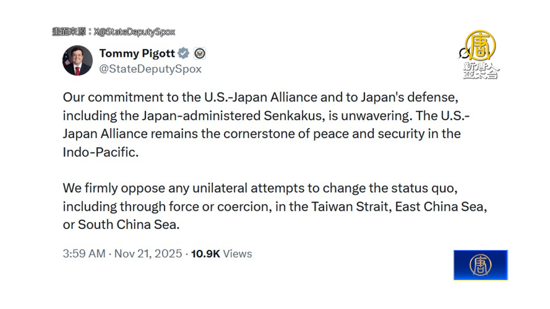 【新唐人亞太台 2025 年 11 月 21 日訊】中共對區域安全的威脅升高,日本首相高市早苗發表「台灣有事」言論,引起中共在經濟、旅遊等多方面進行報復。美國國務院副發言人皮戈特在台北時間今晨,主動發文表示,對美日同盟的承諾堅定不移。無論在台海、東海或南海,美國堅決反對片面改變現狀的企圖,包括透過武力或脅迫手段。另外,總統賴清德昨天中午發布大吃日本海鮮的照片,還說「今天午餐有來自鹿兒島的鰤魚,跟北海道的帆立貝」,力挺日本海產,日本網友留言感謝,有網友還回憶2021年中共禁止台灣鳳梨進口,日本已故前首相安倍晉三,同樣在社群平台上發布,同框台灣鳳梨的合照。
