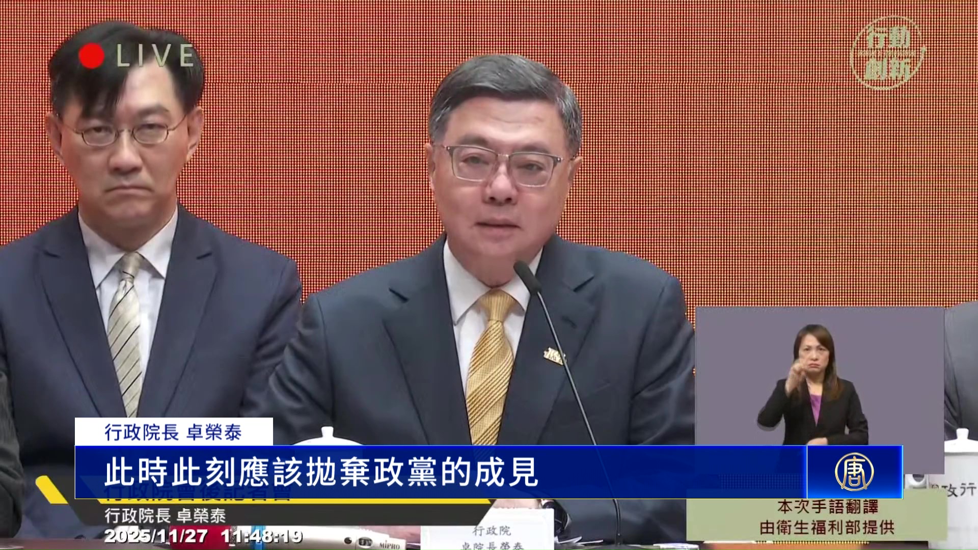 行政院長 卓榮泰:「我還是要懇求國內的同胞,以及國內的各政黨,沒有國哪有家,沒有國哪有黨,此時此刻應該拋棄政黨的成見,以國以家為念,以人民為念,當我們在過去這段時間,持續看到中共各種形式的侵擾,我們極力的向人民表達,政府有守護國家主權跟安全的能力跟決心,然而我們看到對方這種侵擾的形態,頻率持續的增高,我們更應該負責任的向人民說,此時此刻政府更需要提高,我們自己自我防備的能力。」