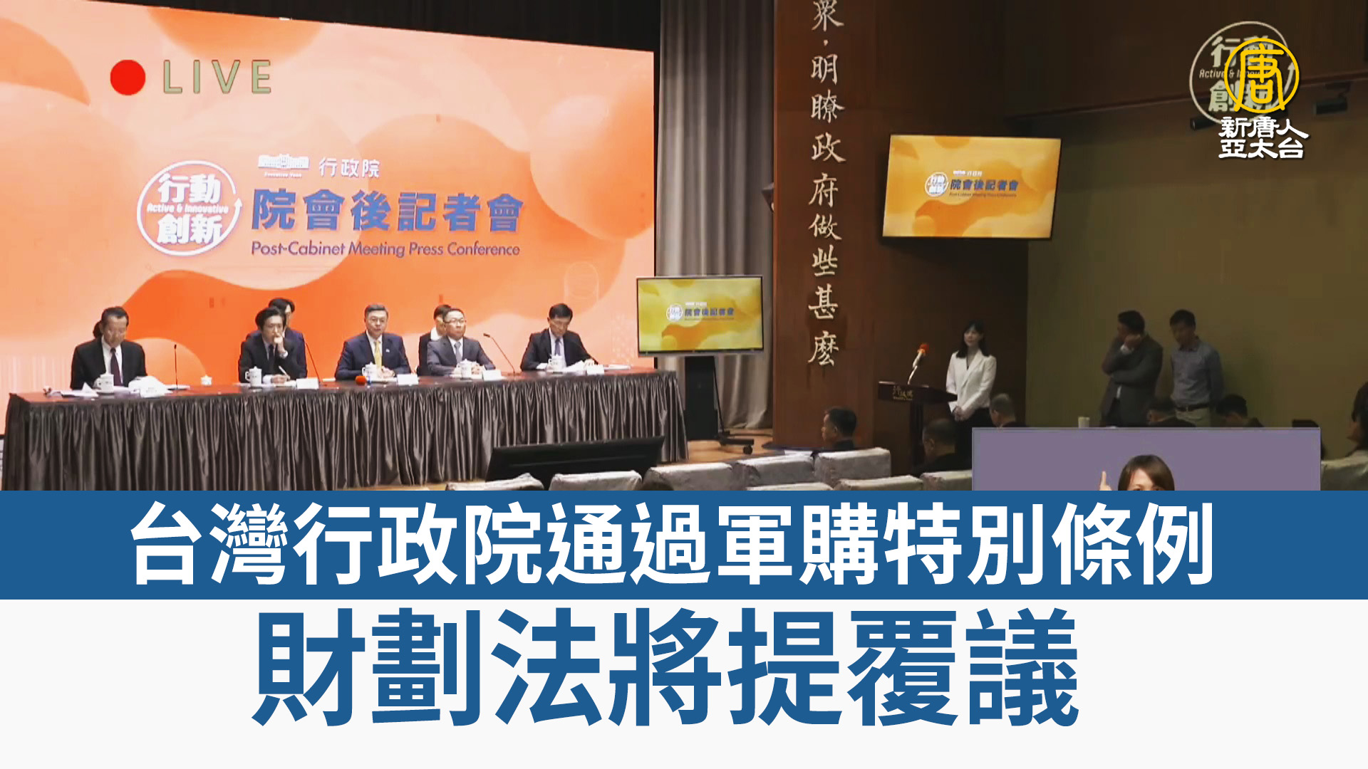 【新唐人亞太台 2025 年 11 月 27 日訊】台灣立法院日前三讀通過財劃法部分條文,行政院認為嚴重影響政府財政健全,院長卓榮泰今天表示,將提出覆議案。而行政院會也通過,總統賴清德日前提出的400億美元國防特別預算,草案將送交立法院審議。