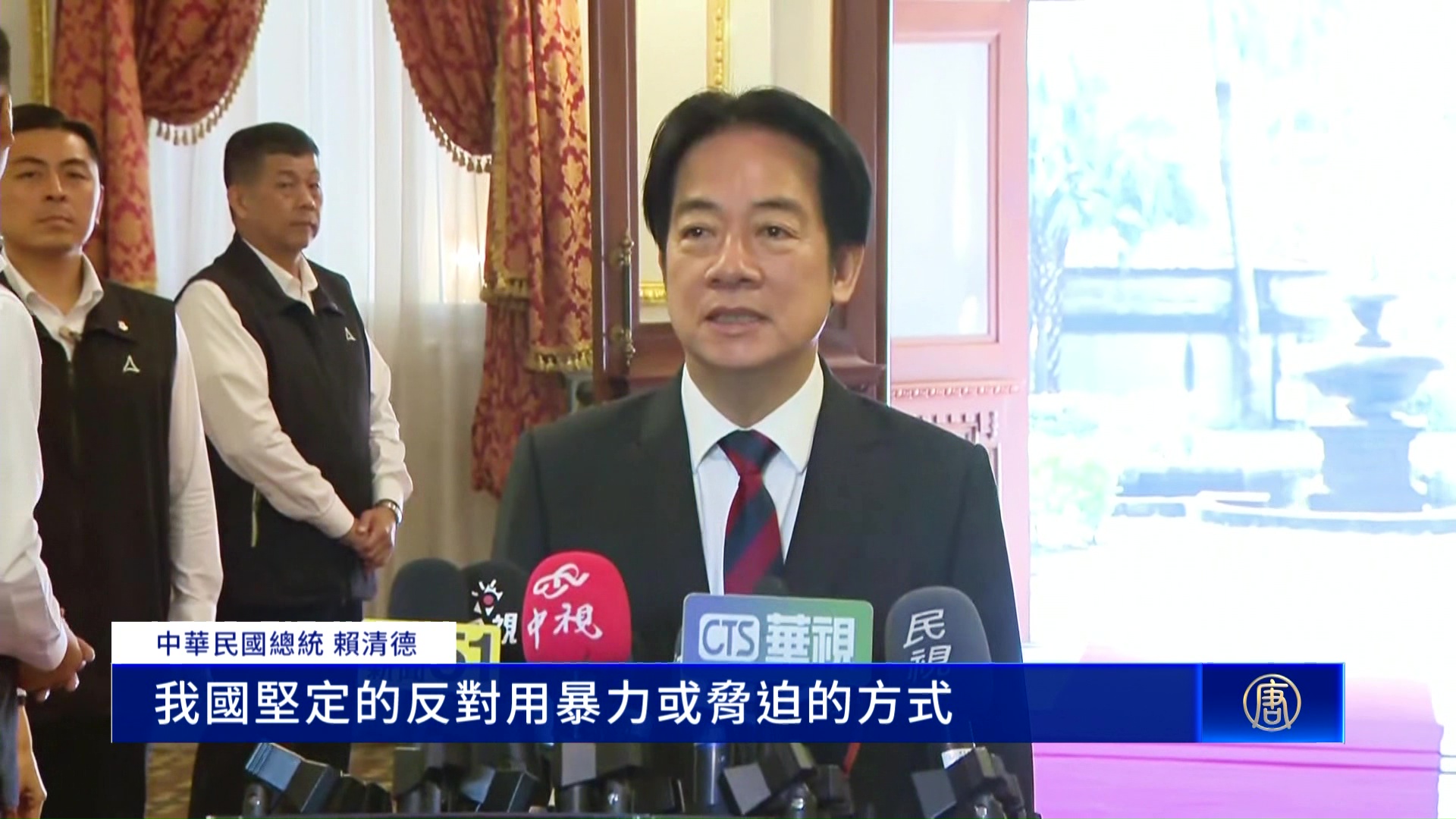 中華民國總統 賴清德:「這是非常不恰當的行為,我國堅定的反對用暴力或脅迫的方式改變區域的和平穩定的單邊行為,和平無價戰爭沒有贏家,和平必須要各方來促成,中國同樣有責任。」
