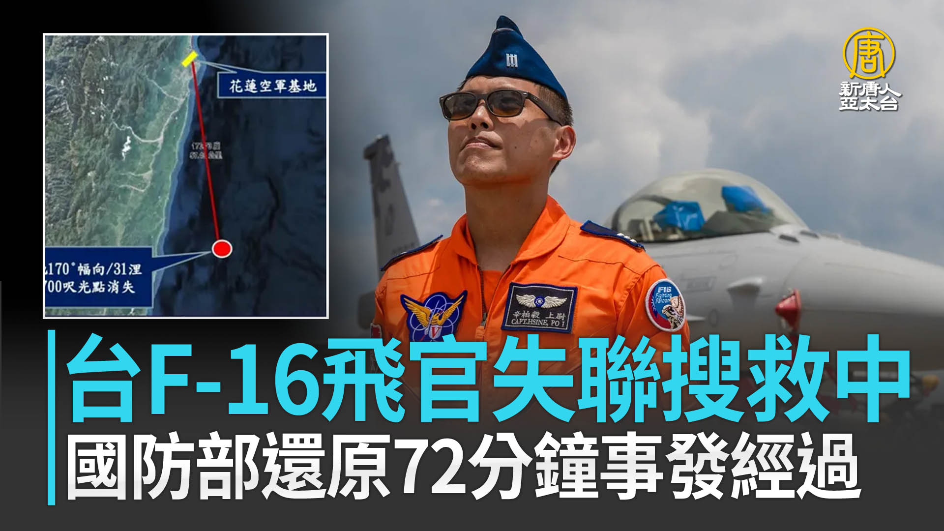 【新唐人亞太台 2026 年 01 月 07 日訊】台灣空軍1架F-16V戰機昨晚失聯,飛官辛柏毅上尉疑似在花蓮豐濱鄉東面10浬跳傘,各單位搜救中。空軍指出,辛柏毅曾3度喊預計跳傘,隨後雷達光點消失,無法確定是否跳傘。