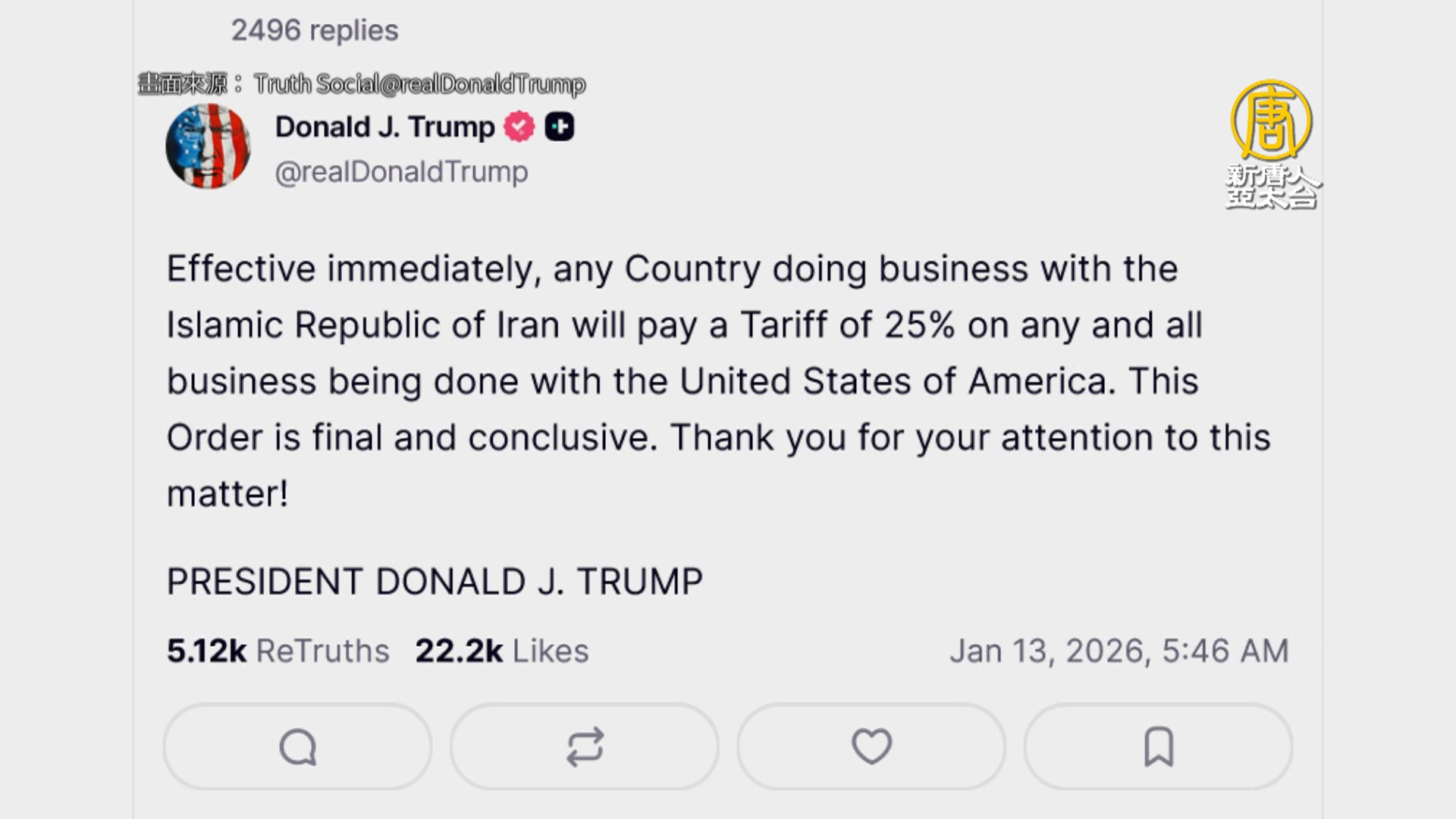 【新唐人亞太台 2026 年 01 月 13 日訊】再來看到,台北時間今晨接近六點時,美國總統川普發文寫到,即日起,任何繼續與伊朗伊斯蘭共和國進行貿易的國家,都將面臨美國對其所有貿易,加徵25%的關稅。川普昨天已經警告伊朗當局的鎮壓行徑,強調已經跨越紅線,正評估軍事介入的選項,而伊朗外長稱,已為戰爭做好準備,也準備談判。