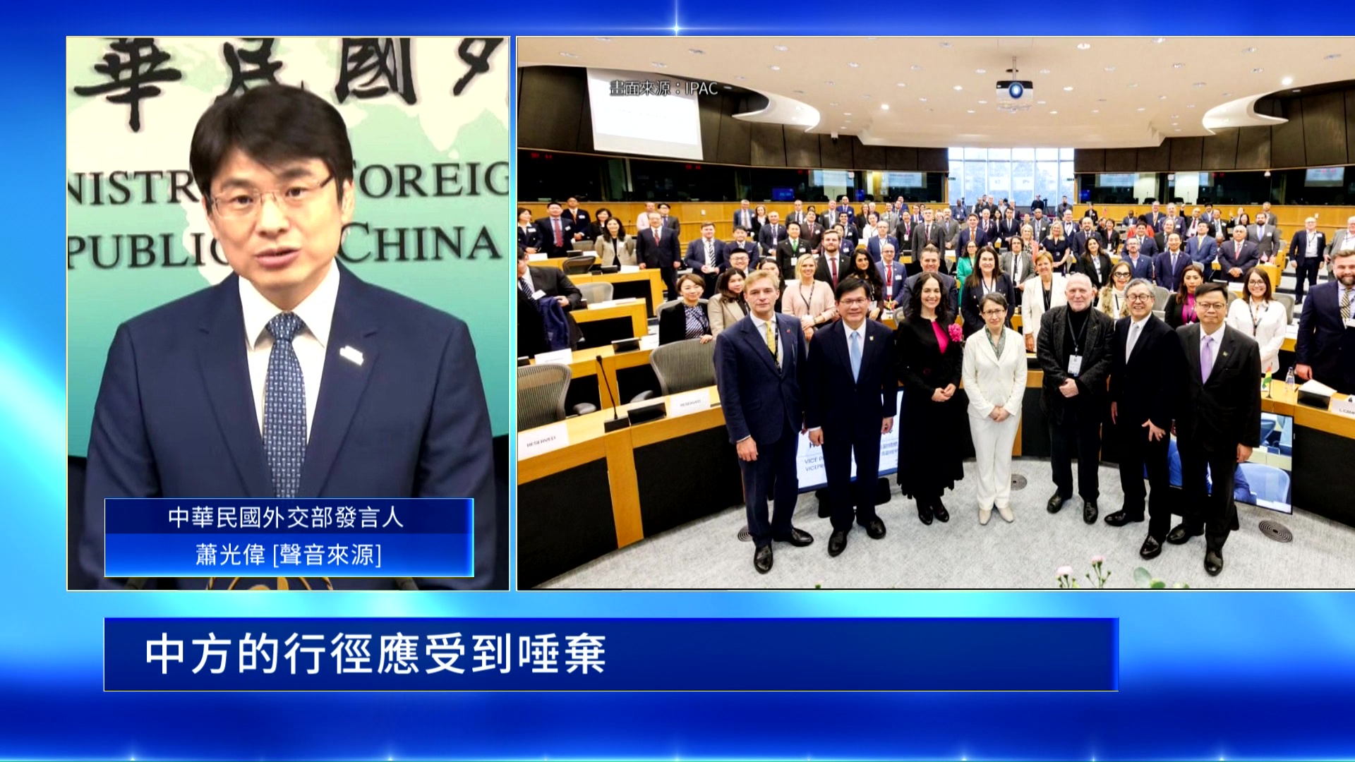 中華民國外交部發言人 蕭光偉[聲音來源]:「外交部嚴正譴責,中共持續以各種卑劣手段,打壓台灣的國際空間,我國高層赴歐盟國家訪問,是台灣與歐洲的正常交往與互動,並受到歐洲各方的歡迎,有助台歐互惠互利關係的發展,完全與中共無關,中方更無權置喙。反觀中共,對各國採取各種脅迫手段,並以武力威脅台灣,破壞全球與印太的和平穩定,威脅歐盟的直接利益,中共才是真正破壞歐洲國際關係的一方,中方的行徑應受到唾棄。」