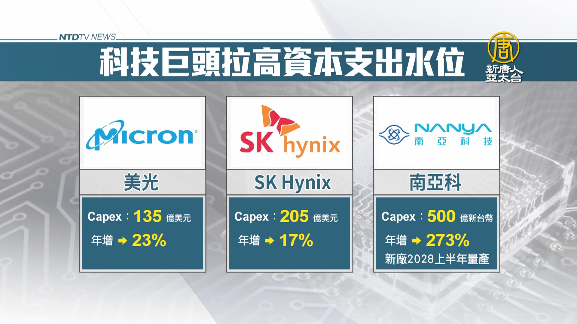 【新唐人亞太台 2026 年 01 月 20 日訊】全球正掀起新一波「記憶體」短缺浪潮,美國、南韓記憶體業者,擴大今年資本支出水位,台灣記憶體大廠南亞科,也決議今年資本支出增加到2.7倍,達到5百億新台幣,並預料這波供貨短缺,將延續到2027年。