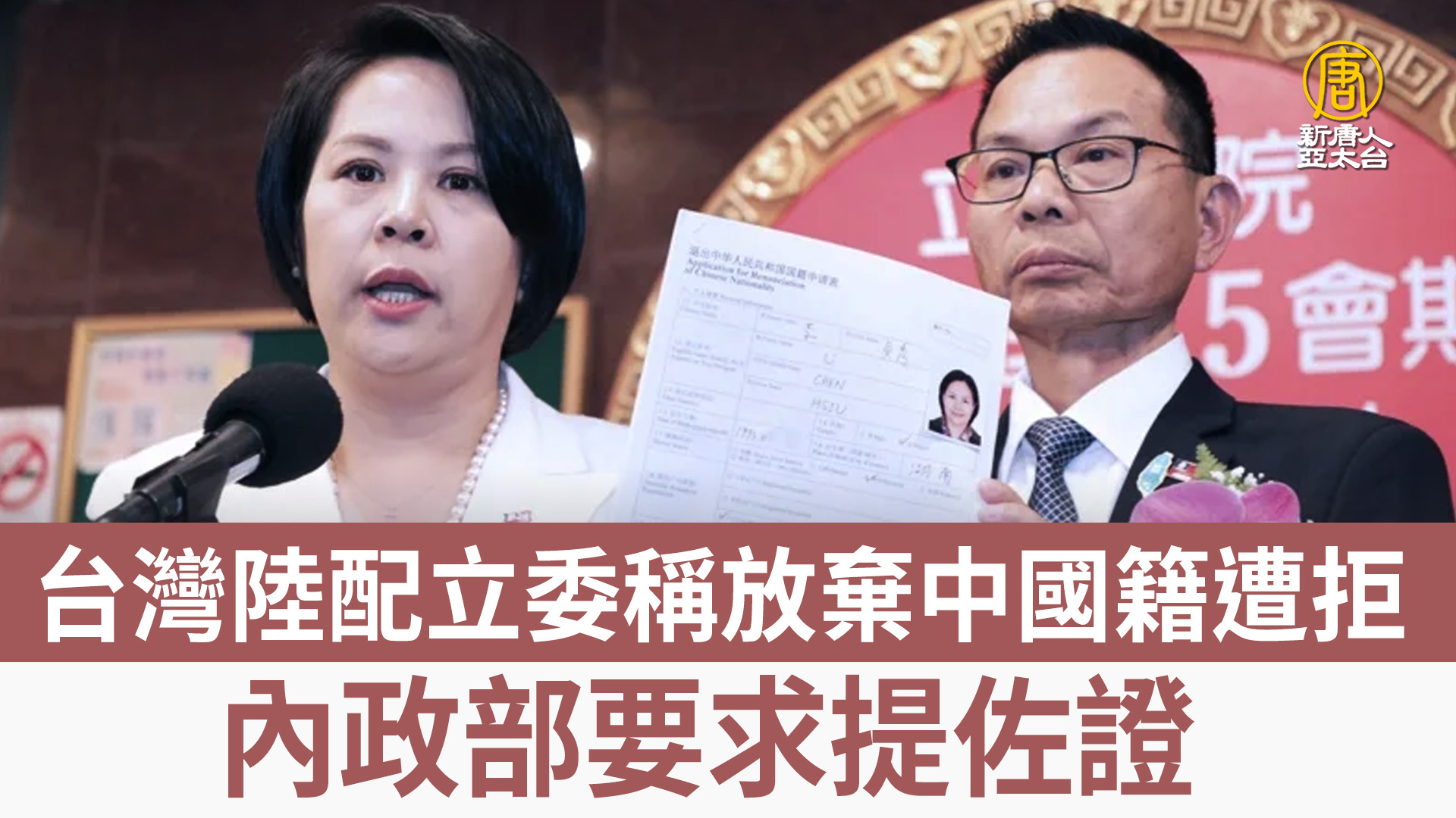 台灣陸配立委稱放棄中國籍遭拒 內政部要求提佐證