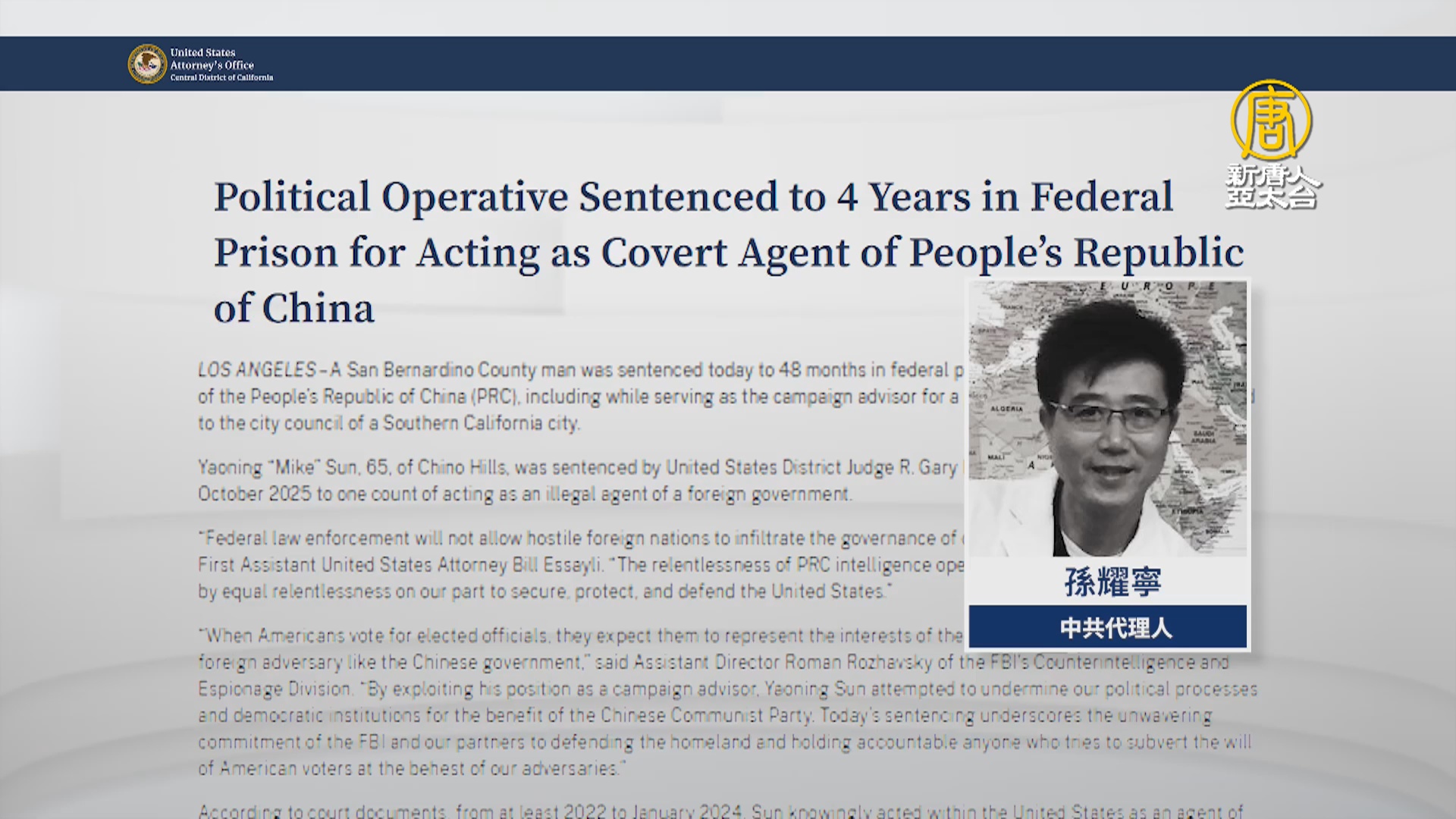 「美國加州中區檢察官辦公室」週一宣布,判處現年65歲的華人孫耀寧(Yaoning 「Mike」Sun),48個月聯邦監禁,罪名是充當中共代理人。