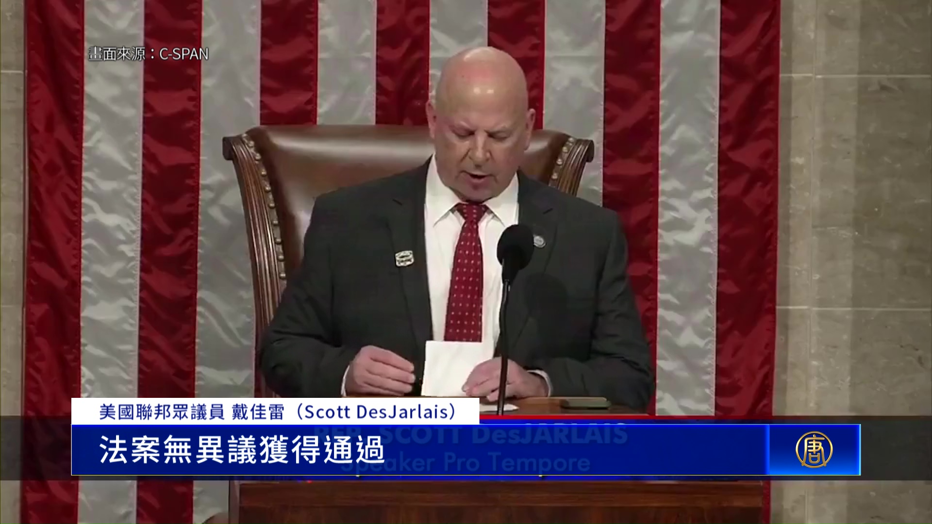美國聯邦眾議員 戴佳雷(Scott DesJarlais):「本次投票結果為:贊成 218 票,反對 213 票,法案無異議獲得通過,重新審議的動議被擱置。」