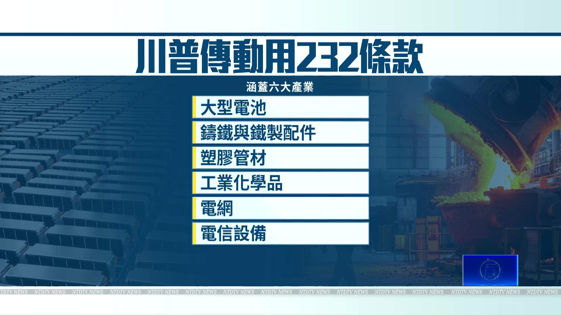 《華爾街日報》報導,知情人士透露,川普正在考慮,動用232條款,對大型電池、鑄鐵與鐵製配件、塑膠管材、工業化學品,以及電網與電信設備等產業,課徵關稅。不過要啟動這項關稅,還要先經過美國商務部調查。