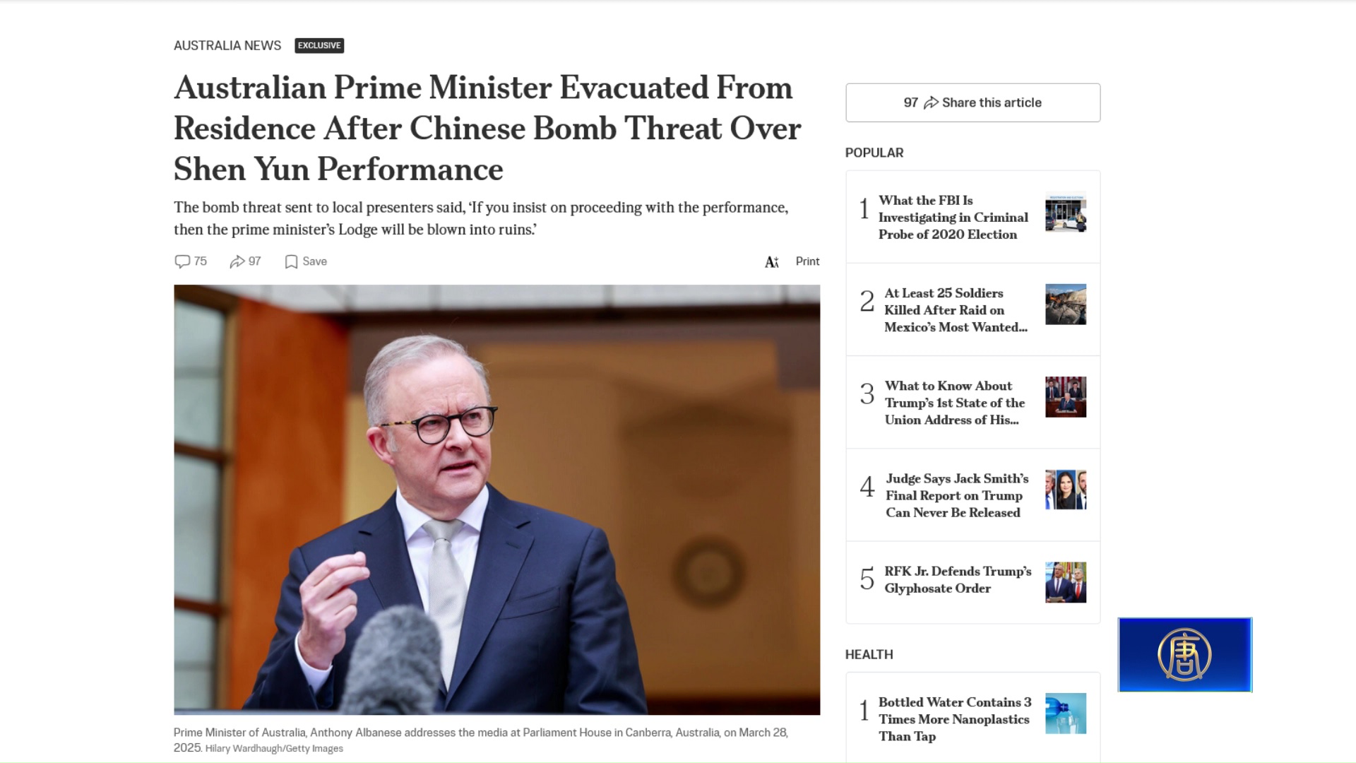 澳洲迎來享譽國際的神韻藝術團演出,然而,澳洲總理艾班尼斯和其他高官24日收到摻雜簡體中文字的炸彈威脅信,艾班尼斯緊急從坎培拉的官邸撤離,3小時後,在未發現任何可疑情況後返回。澳洲聯邦警察(AFP)發言人表示,警方未發現「目前對社區或公共安全構成威脅」。