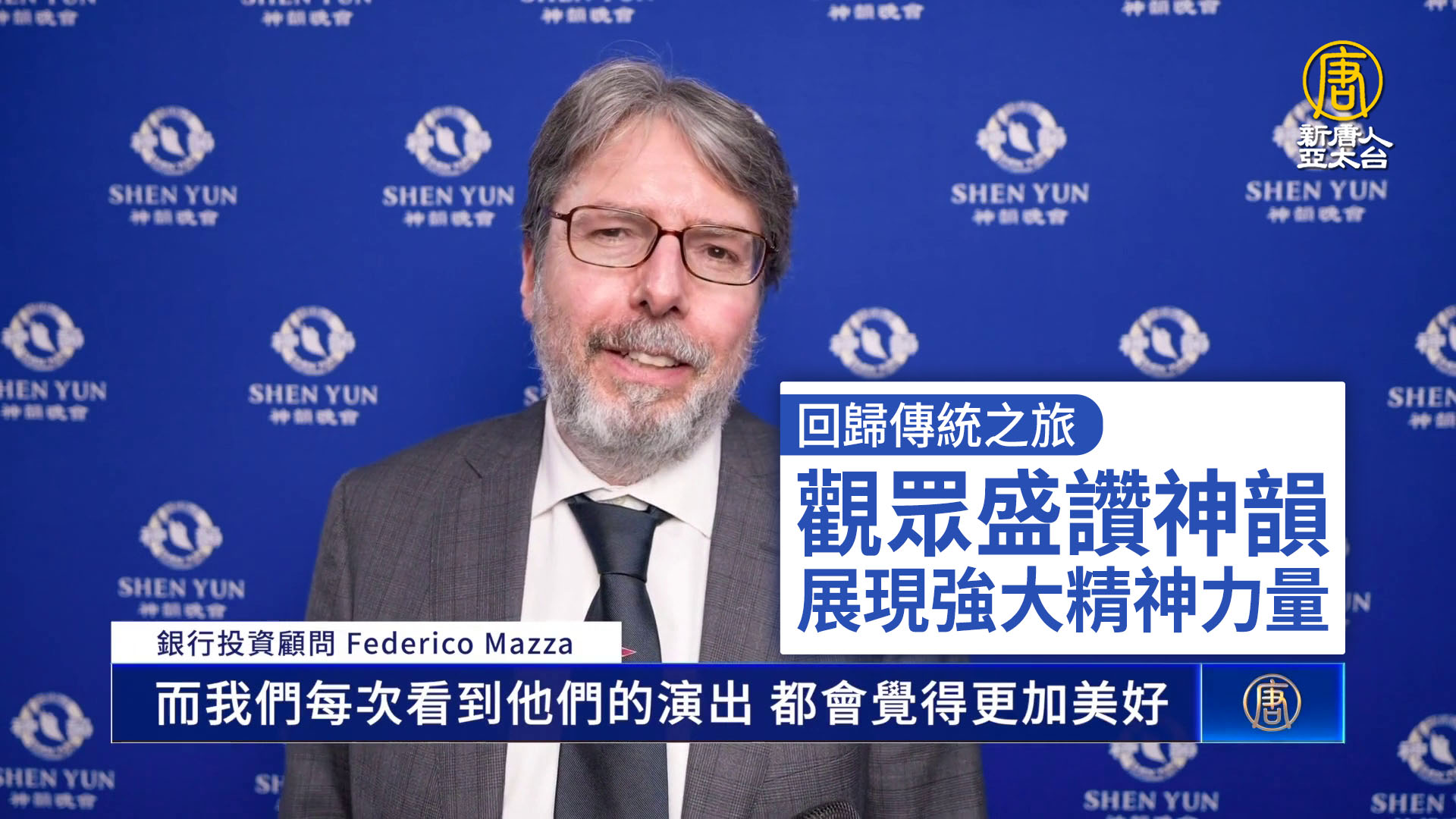 銀行投資顧問 Federico Mazza:「這是我第二次觀賞神韻演出了,感覺和以前看的都不一樣。煥然一新,同樣精彩。我覺得(觀賞)演出就像是一次穿越時空,回到傳統中國的旅程,而這種傳統的中國文化現在幾近失落。這就是神韻演出帶給我的感覺,她深深地打動了我。」
