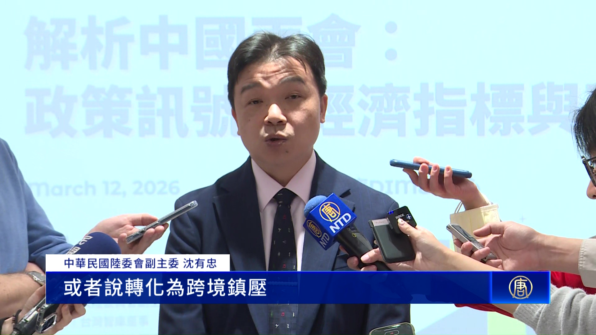 中華民國陸委會副主委 沈有忠:「中共會在今天下午正式的通過一部所謂的這個民族團結進步促進法。那這部法律雖然它比較重點是擺在對於中國境內有非常多的少數民族,但我們也還是會看到說因為它涉及了境外,然後也提到了要推進民族的團結跟國家的統一。所以當然也有可能就會把這個當成是法律基礎,然後外溢到來去變成是處理兩岸問題的一個法律依據。所以我們還是基於這個料敵從寬會認為說中共有很多的這個作為,名義上是在對內宣稱要維穩,但事實上也都有可能轉化為長臂管轄,或者說轉化為跨境鎮壓,甚至也有可能會變成是破壞兩岸關係的一個可能性。事實上不只是我們西藏的朋友、香港的朋友,就連本會、陸委會在去年大概就收了十幾次的這個炸彈威脅的一個恐嚇。比如說我印象非常深刻的就是連外面電影院在播《國有器官》,它也要來恐嚇我們陸委會。那還有很多的黑數可能不見得有揭露出來。但是我們已經掌握到的這個部分大概就有超過100例,在2025年的時候。那範圍包含的像是企業,包含的像是個人,包含像是政府官員,還有民意代表等等。」
