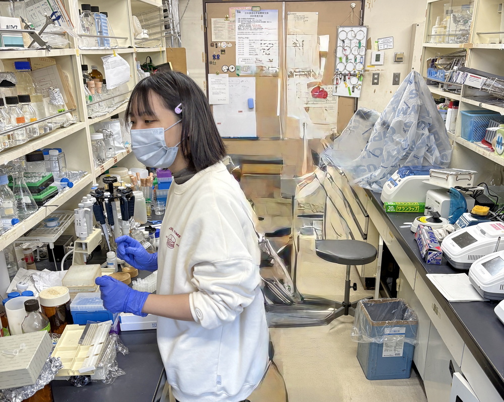 嘉義大學農藝學系助理教授林孟淳,於東京大學實驗室進行植物化感作用測試。(嘉大提供)
