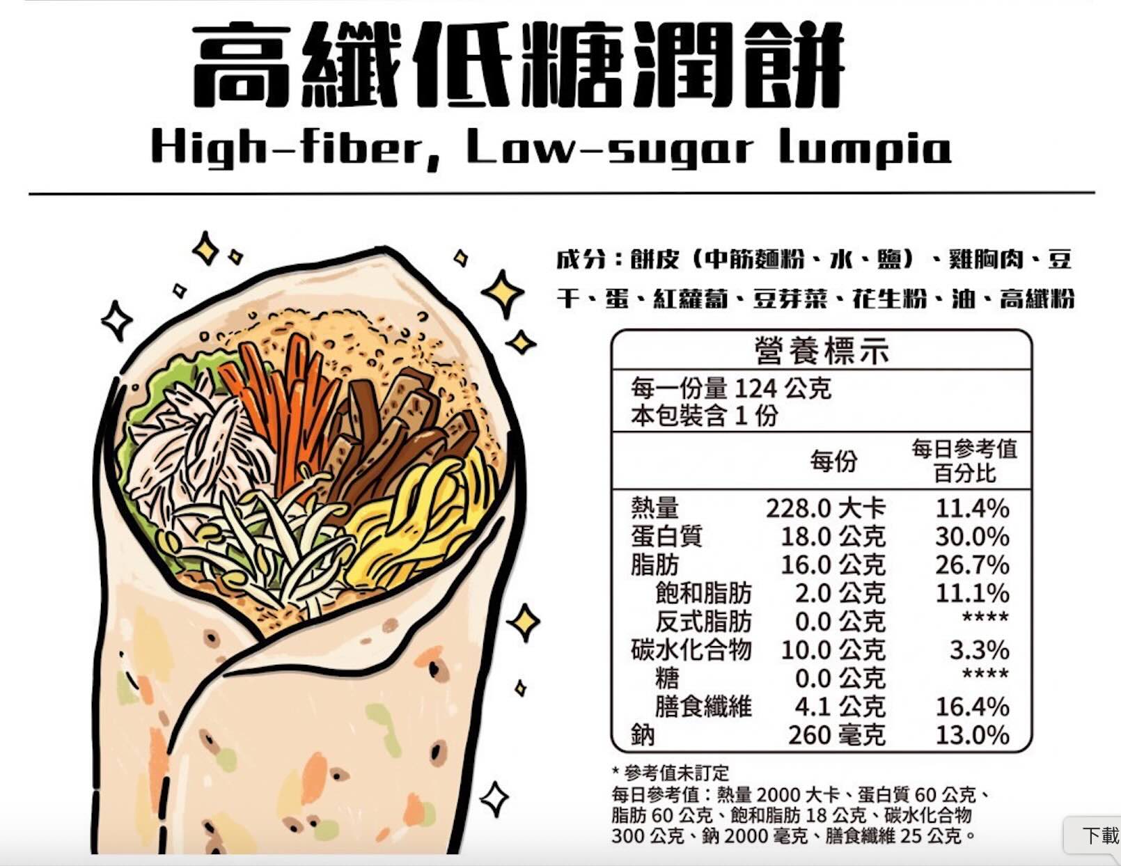 該配方以赤藻糖醇取代糖粉,兼具低熱量與甜味,並有助降低血糖波動。內餡則選用雞胸肉、豆干、蛋皮與多樣蔬菜,並控管烹調用油,讓整體更為清爽均衡。潤餅皮則以中筋麵粉、水、高纖粉及少量鹽巴調製而成,不僅提升膳食纖維攝取與飽足感,口感更保有柔軟與延展性,是民眾在家也可透過平底鍋輕鬆製作的餅皮配方。成品每份約228大卡,為一般市售潤餅的一半,蛋白質含量達18公克、膳食纖維4.1公克,在降低熱量的同時兼顧營養與風味,翻轉傳統潤餅高油、高糖的既定印象。