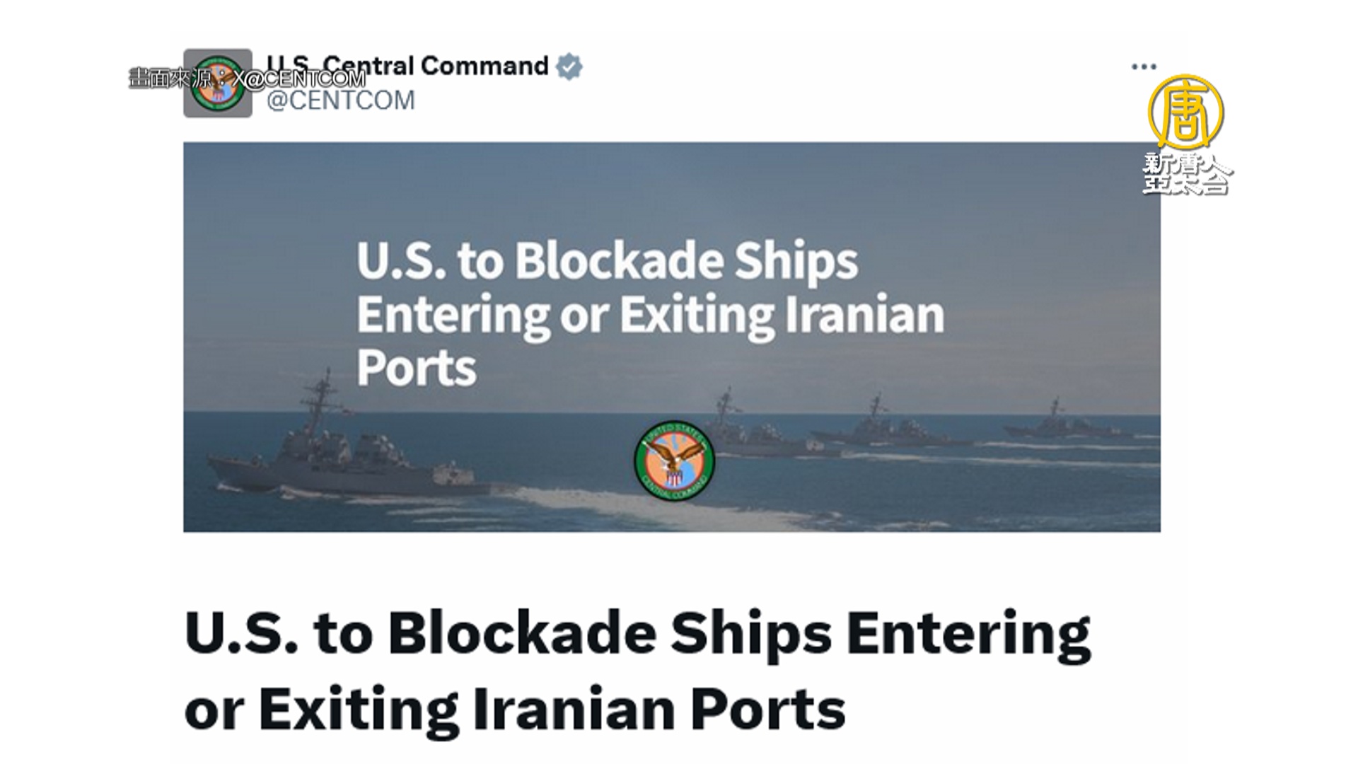 【新唐人亞太台 2026 年 04 月 13 日訊】美軍中央司令部兩個小時前發出通知指出,根據總統公告,美國中央司令部部隊將於美國東部時間4月13日上午10點開始,也就是台灣時間今天晚上10點開始,封鎖所有進出伊朗港口的海上交通。