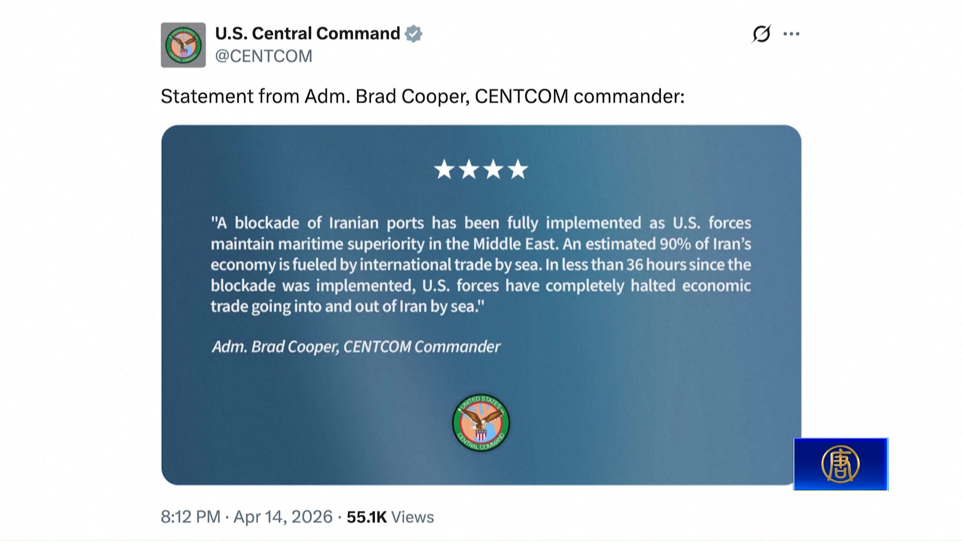【新唐人亞太台 2026 年 04 月 15 日訊】透視國際線先帶您聚焦,美伊戰爭,美軍封鎖霍爾木茲海峽與伊朗港口,美軍中央司令部週二(14 日)宣布,已完全切斷伊朗海上進出口貿易。 一名美國官員指出,自 13 日封鎖開始以來,美國海軍部隊已經攔截 8 艘進出伊朗港口的油輪。