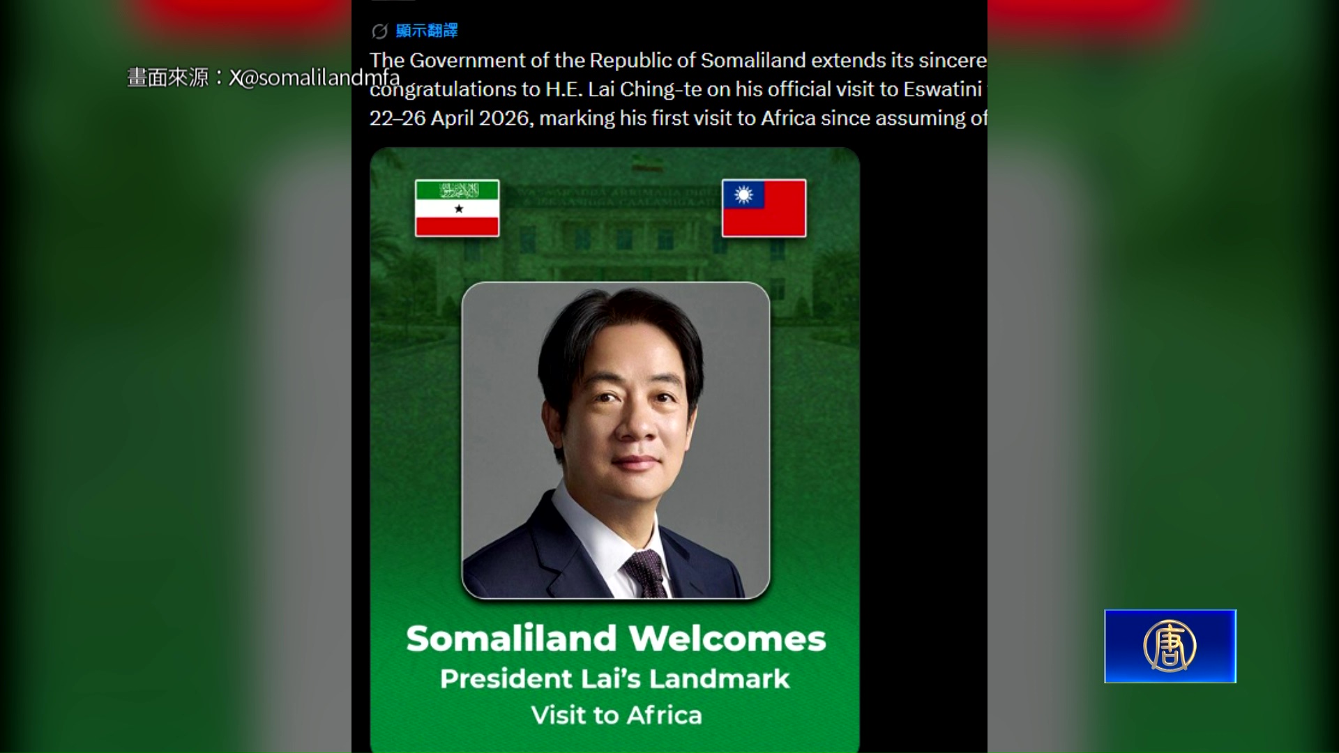 【新唐人亞太台 2026 年 04 月 20 日訊】扼守曼德海峽的非洲索馬里蘭,主動發文刊出中華民國國旗照,中華民國總統賴清德將在22日率團訪問非洲友邦史瓦帝尼王國。