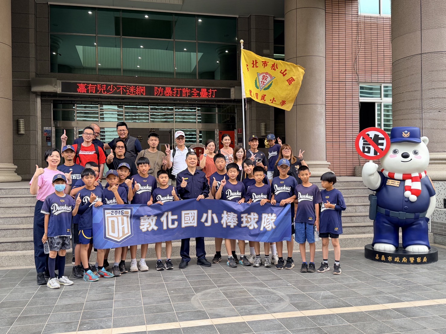 台北市敦化國小棒球隊南下嘉義市,參與「嘉有兒少不迷網 防暴打詐全壘打」擴大預防犯罪宣導活動。(嘉義市警局提供)