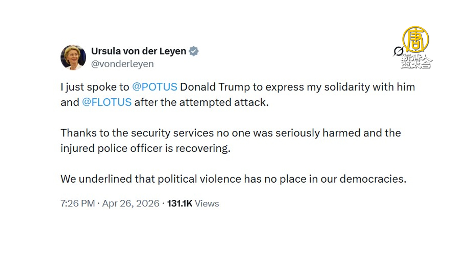 【新唐人亞太台 2026 年 04 月 27 日訊】美國白宮記者協會晚宴上,爆發槍擊事件,世界各國領導人紛紛發聲。表達支持川普總統,並譴責搶手的暴力行為。歐盟執委會主席馮德萊恩,已經和川普總統,通話問候,她發文寫到,政治暴力在我們的民主社會中,沒有任何容身之處。另外,日本首相高市早苗、以色列總理內塔尼亞胡、英國首相史塔默、法國總統馬克宏,還有中華民國總統賴清德都發聲,強調深感震驚和強烈關切,並且,強烈譴責任何形式的,政治暴力。