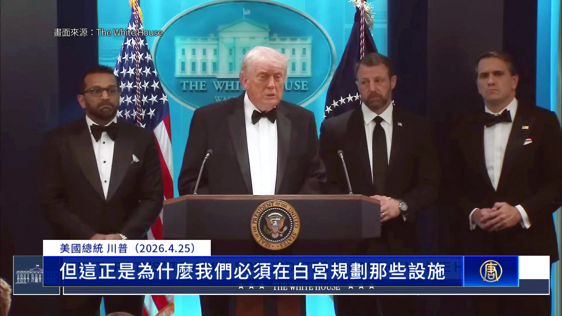 【新唐人亞太台 2026 年 04 月 27 日訊】這場白宮記者協會晚宴槍擊案,也讓外界關注,安保措施問題,川普總統強調了,白宮宴會廳建造的必要性。