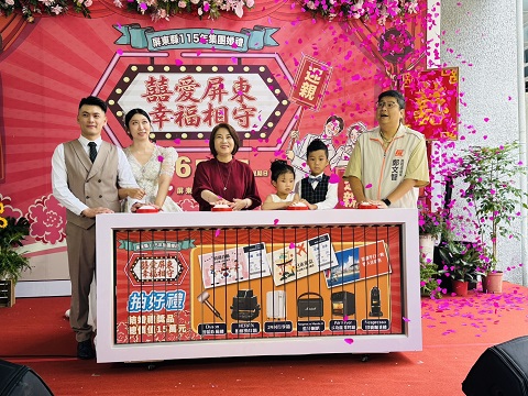 【新唐人亞太台 2026 年 04 月 27 日訊】屏東縣政府年度盛事「集團婚禮」,將於6月7日在屏東縣民公園C倉庫溫馨登場,今年以「囍愛屏東,幸福相守」為主題,縣長周春米今天(27日)在宣傳記者會上加碼宣布多項好禮,除提供萬元提貨券與專業婚紗造型服務外,婚禮當日更將抽出日本東京、南韓首爾雙人來回蜜月機票,並贈送夏都住宿券及總價值6萬元之家電禮品,從蜜月旅行到新婚生活全面照顧,一次滿足成家所需,展現縣府作為年輕人「成家神隊友」的用心。