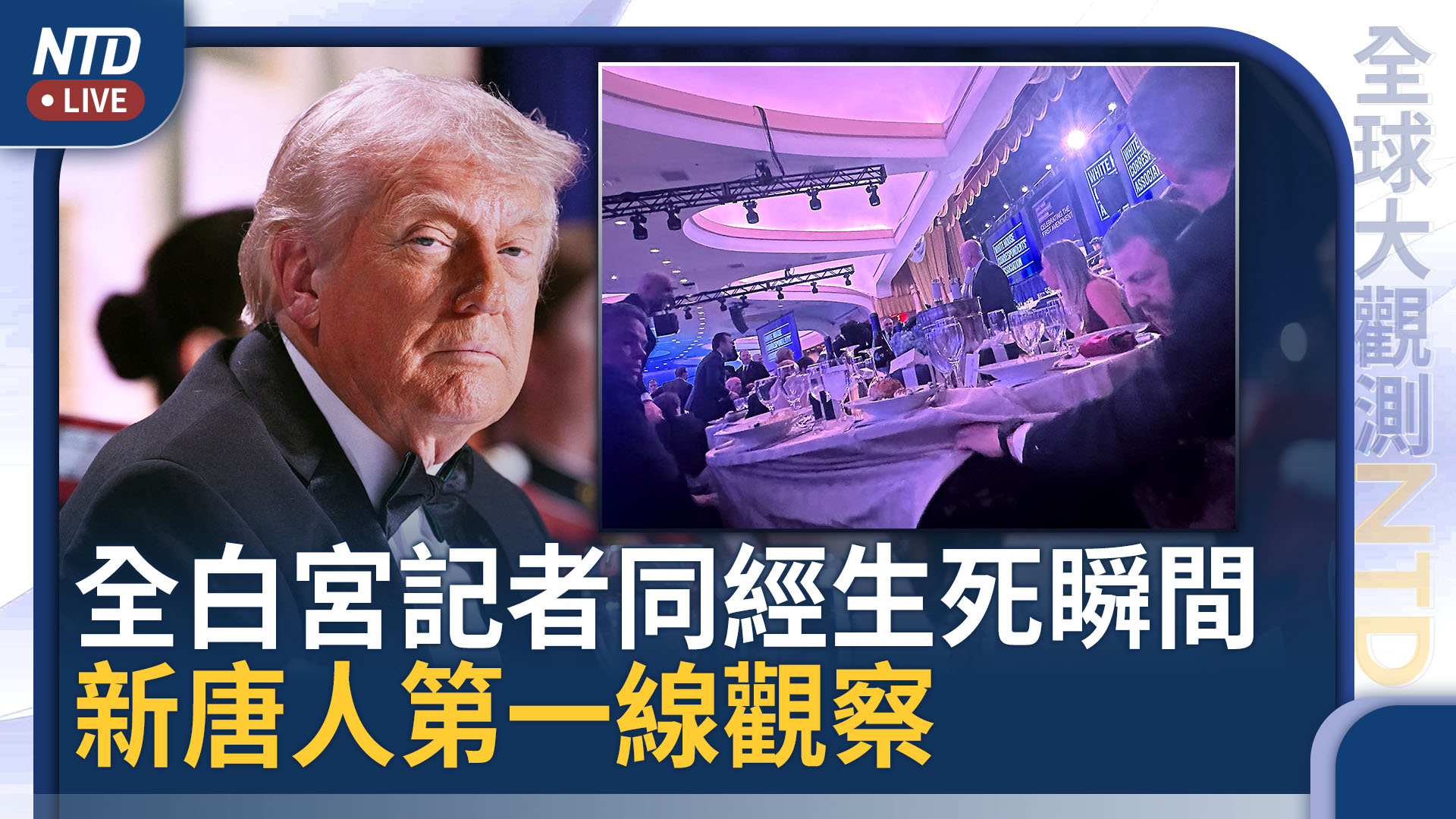 英文新唐人白宮記者 陶明:「其實,我們當時坐在,離宴會廳外圈很近的地方,我們可以清楚聽到槍聲響起。接著你立刻就能看到,安保人員、特勤局人員,試圖爬過桌子,甚至幾乎是爬過人群,要趕到宴會廳正前方的中央,也就是內閣成員們就座的地方。我想就是在那一刻,每個人才意識到,這實際上是一起安全事件。」