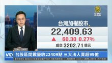 2024-07-30 17:33:23本周華爾街聚焦大型科技股財報,以及聯準會對最新經濟數據解讀,美股主要指數周一收盤漲跌互見,市場預期9月降息機率升高,美債殖利率走低,公債價格延續漲勢,有機會挑戰連續三個月上漲,創2021年以來最長連漲紀錄,部分資金從股市撤出,轉向債券市場。台股方面,一連三天下跌,周二跳空開低,一度下挫260點,跌破21900點,不過賣壓出現去化跡象,台股開低走高,權值股聯發科、鴻海、大立光,股價由黑翻紅,帶動終場收在22,223.57點。三大法人賣超201億。