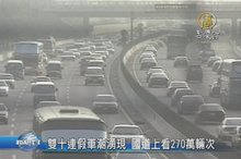 2015-10-08 20:01:34明天開始,就是3天的國慶連假了,今天高速公路已經湧現車潮,根據高公局路況預測,明天車流量將達最大,上看270萬輛次, 而在連假期間,高速公路將採單一費率收費,取消每天20公里免費里程,明天晚間11點到星期六上午6點,國道全線將暫停收費,從明天上午7點開始,有部分路段就會開始實施高乘載管制,提醒觀眾朋友注意。