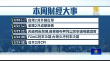2023-03-20 17:15:13帶您速覽本周財經大事,最受關注的就是美國聯準會將公布利率決議,市場預期將持續升息 1 碼。另外台灣央行也將公布利率決議,市場預期升半碼或不升息。而在 Fed利率決議發布前,美國財長葉倫和國務卿布林肯出席參議院聽證會,市場關注將對國際貿易、外交政策等方面發表看法,另外,日本的 2 月 CPI 數據也將公布,外界觀察通貨膨脹是否出現明顯回升。