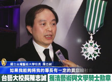 2016-03-28 20:56:01台灣藝術大學校長陳志誠,日前接受法國政府所頒發的「藝術與文學騎士勳章」。法國文化部長說,陳校長通過組織卓越的演出和展覽,讓人們瞭解台灣文化,是文化的巨匠。