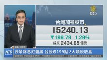 2022-08-17 07:03:12早安新唐人先關心最新市場動態,美國最大零售商沃爾瑪(Walmart)與居家修繕龍頭家得寶,公布財報喜訊,激勵零售股氣勢,不過,美債殖利率上升打擊蘋果等科技股,晶片股賣壓湧出,四大指數收盤漲跌不一。那指收跌 0.19%,費半下跌超過1%,道瓊則是升近 240 點,台積電ADR下跌1.77%。