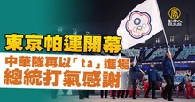 2021-08-25 07:18:56東京帕運昨晚7點舉行開幕典禮,這次進場與東京奧運一樣,依照各隊日文發音排序,中華隊排在83順位,再次以五十音「ta」行的順序,位在南韓隊伍後出場,總統在臉書發文指出,再一次透過轉播,看見台灣選手站上世界舞台,「帕運的英雄們,大家都為你們加油!」 這次由兩位視障選手楊川輝、劉雅婷身穿中華隊戰袍,共同擔任掌旗官,中華隊一共有13名團員出席。人數比起東奧開幕式還要多了3位。這次台灣有10名選手,參加桌球、羽球、健力、游泳、田徑、柔道共6個項目。