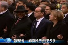 2015-01-12 07:02:33早安新唐人,帶您看到國際焦點;巴黎反諷週刊《我是查理》遭槍擊血洗後,台北時間昨晚10點,有44國領袖破天荒 齊聚巴黎,參加反恐遊行,而法國全國超過300萬人上街,創下70多年來的記錄。透過畫面看到,就在槍擊案發生第四天,包括法國總統歐蘭德、德國總統梅克爾、英國首相卡麥隆,全都手挽手,走在隊伍第一排,表情嚴肅,而前所未有的大團結畫面還有,以色列總理尼坦雅胡和巴勒斯坦自治政府主席阿巴斯一起打頭陣,烏克蘭總統波羅申科和俄羅斯外長拉夫羅夫也共同出席。法國全國周日有超過300萬人遊行,反對恐怖主義,悼念死難者