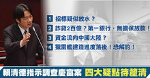 2017-10-27 20:05:01新聞首先來關心,慶富公司建造海軍獵雷艦,卻爆出一連串負面事件。行政院長賴清德指示行政院副院長施俊吉,展開行政調查,將釐清詐貸、招標過程有無違法,更表態追查層級無上限。