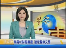 2016-11-14 07:13:09再來看到,樂陞代理董事長 丁萬鳴說,今天無法依規定交出第三季財報,將會被主管機關處以暫停交易處份。但他強調,公司已經找到會計師,預計12月或明年1月交出第三季財報,到時候,將向主管機關申請恢復交易。
