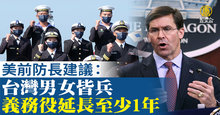 2022-07-19 17:36:41前美國國防部長艾斯培今天建議,台灣應大幅增加國防預算,延長義務役期,讓年輕台灣男性、女性在軍隊中服役至少1年,並進一步加強後備軍人的動員能力,才能讓台灣與美國等盟友的防衛同步化。