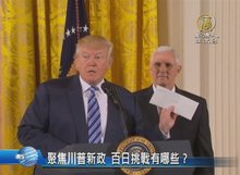2017-01-23 20:17:15繼續來鎖定的是,剛上任的美國總統川普,行程滿檔,預計周五和英國首相梅伊會面,接下來也將與墨西哥總統、日相安倍晉三見面。川普政府的百日挑戰,不僅包括國際局勢,還包含國內經濟、就業、能源等問題。新政府能否端出令外界滿意的政策進展,備受各界關注。