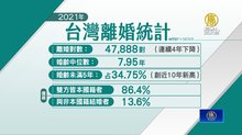 2022-07-23 20:49:20根據內政部最新統計。去年台灣離婚對數共4萬7千8百88對,平均每天有1百31.20對離婚,已連續4年下降。婚齡中位數為7.95年,也就是半數離婚者的婚齡,都沒有超過8年。其中,婚齡未滿5年的人數最多,有34.75%,創下近10年新高。如果以國籍來看,雙方皆本國籍者佔86.4%,與非本國籍結婚者佔13.6%。